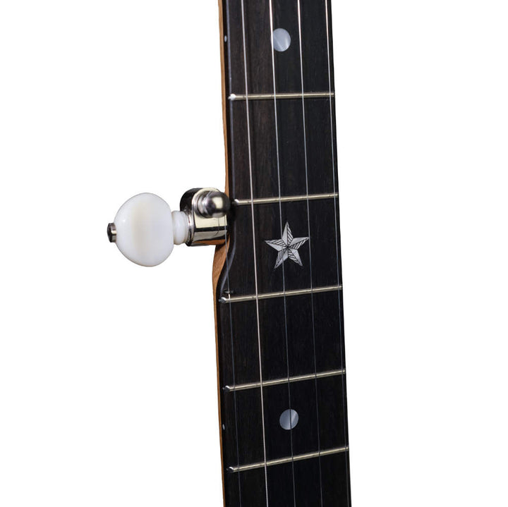 The Vega openback models are made with a white oak neck and 3-ply white oak rim which gives these banjos a crisp and rich tone. These banjos also feature an ebony fingerboard and peghead overlay, a sleek satin finish and are adorned with a gryphon inlay at the peghead - Greg Deering’s own tribute to the incredible inlay work of the late Icilio Consalvi.
