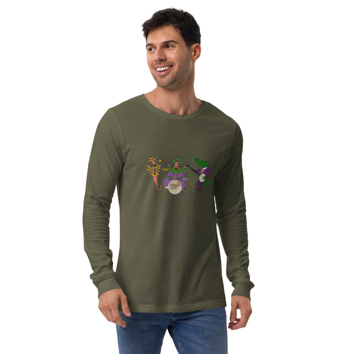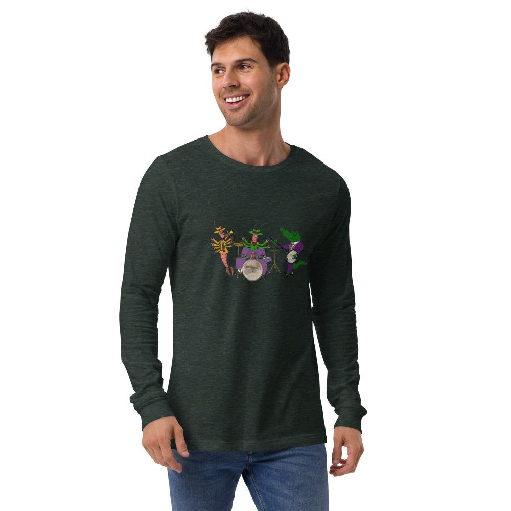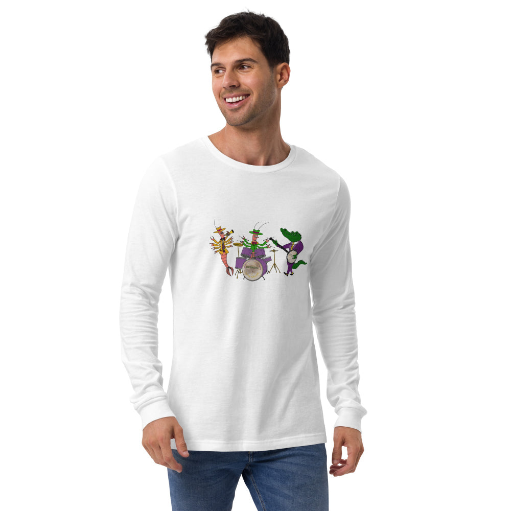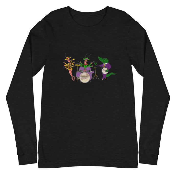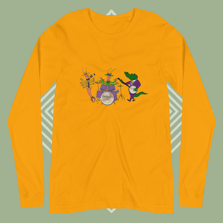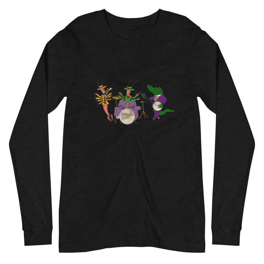 Celebrate carnival season with our Deering Mardi Gras Jazz Band Long Sleeve T-Shirt. Drawn by our own Darren Dugger, this tenor banjo player gator is swinging with his buddies. You can too this Mardi Gras!