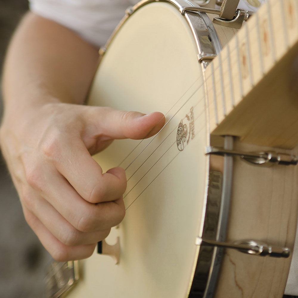 Played with an old time style technique, the Americana is reminiscent of banjos from a period when larger rims were more prevalent which makes the 12” a great setup for playing old time music. A traditional 11” banjo with a frosted top head has a far brighter sound and will “cut” more. Since the combination of the wider 12” rim and the renaissance head makes for a wonderfully laid back sound in comparison, the Americana lends itself perfectly for musicians looking to use the banjo to back up a vocalist or another instrument, instead of playing the a lead instrument role.
