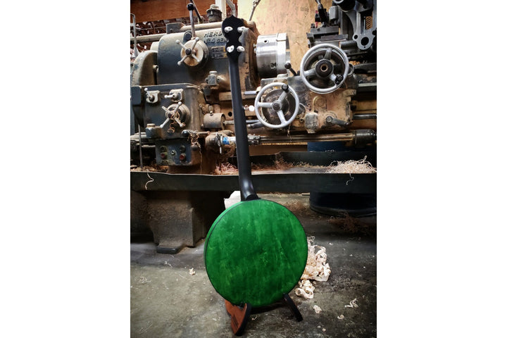 The Washington State Charity Banjo is entirely one-of-a-kind, made with a deep black neck bearing the shape of Washington proudly on the peghead. With pearloid inlays of green set into the Midnight Maple fingerboard, and Evergreen resonator this banjo is truly for the lush state of Washington.