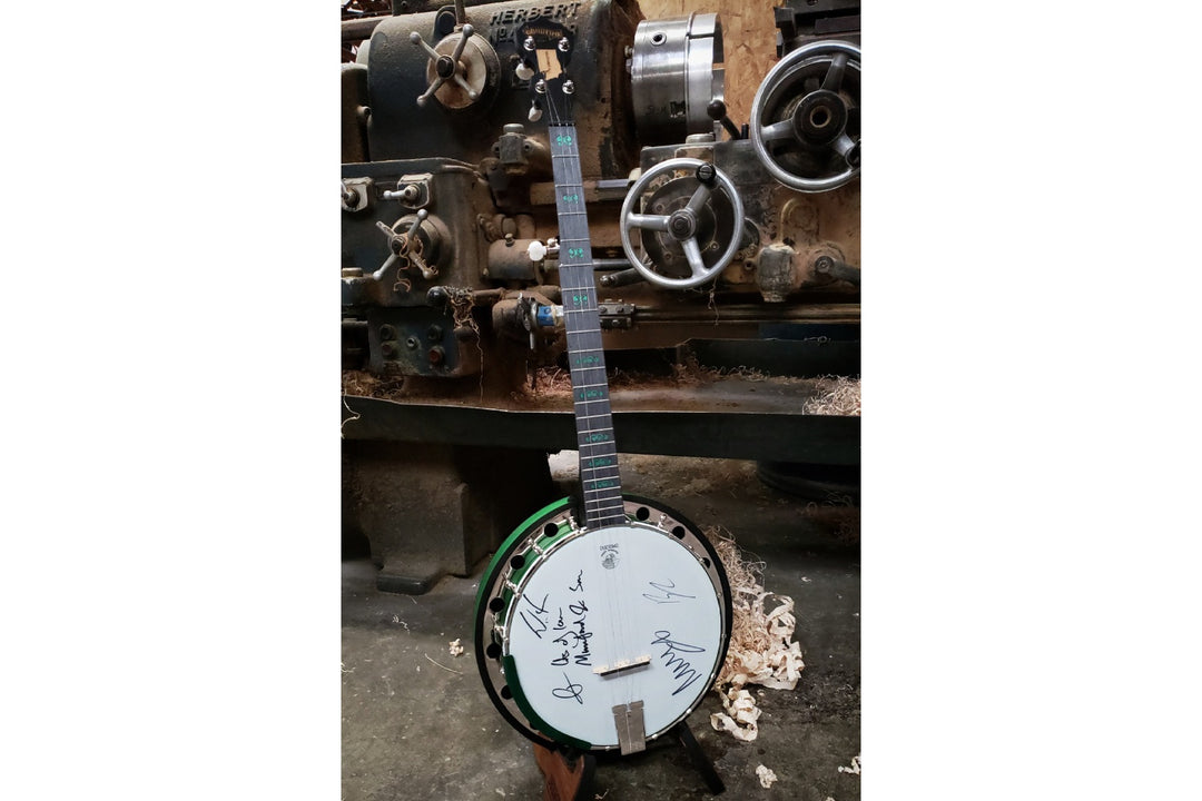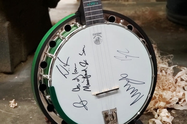 The drum head of the banjo is personally signed by Mumford & Sons with a personal message from the band.