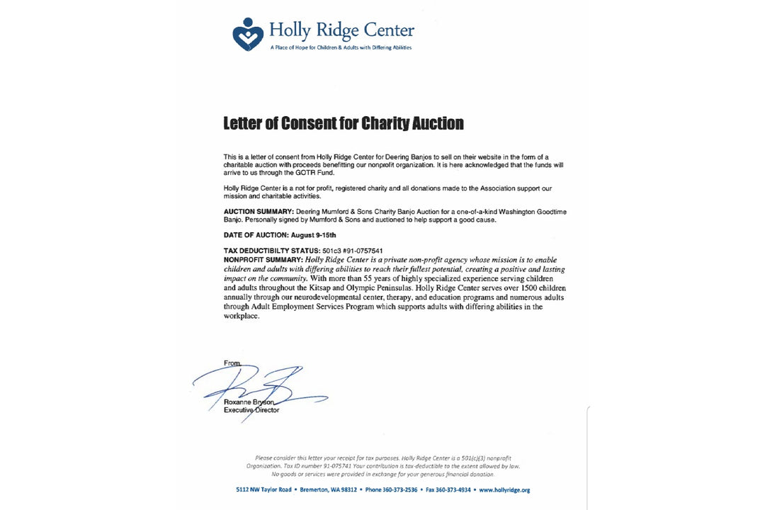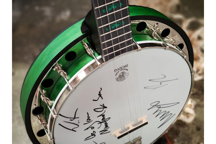 Based on the Deering Artisan Goodtime Two this banjo has a resonator back for projection, and a violin grade maple rim that gives it a bright and clear tone. Designed and built by Deering Banjos at their factory in Spring Valley, California specifically for this auction.