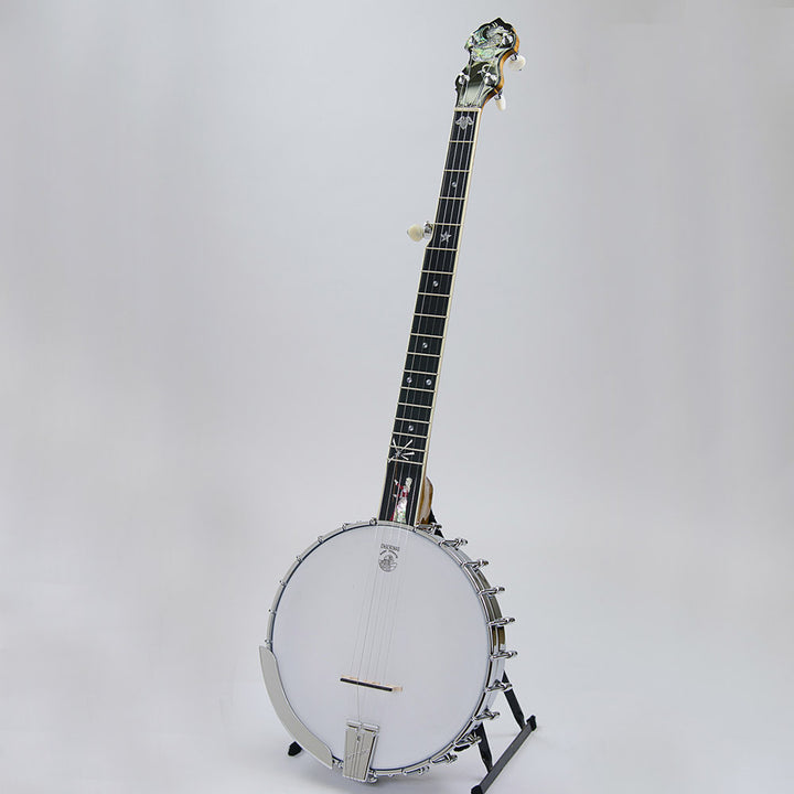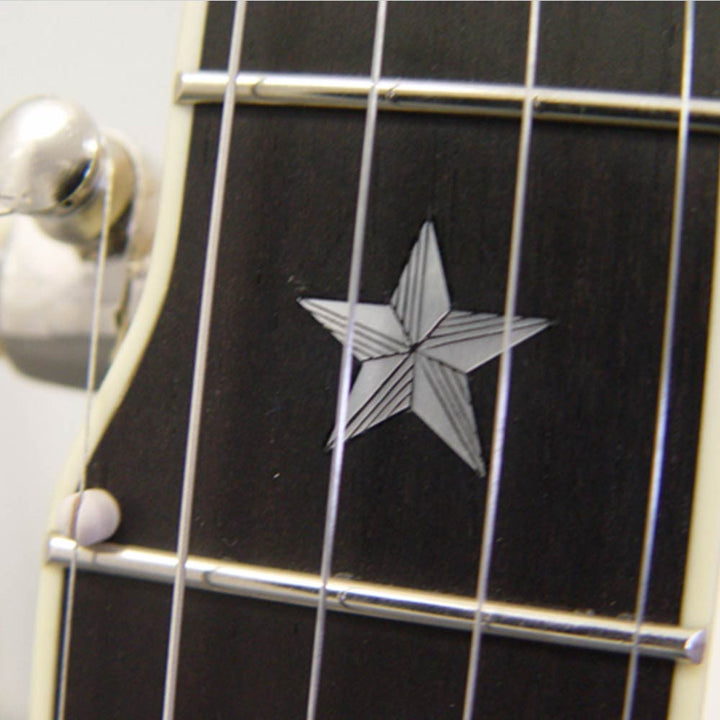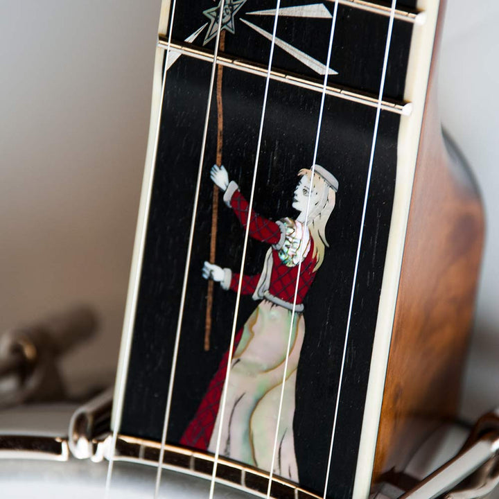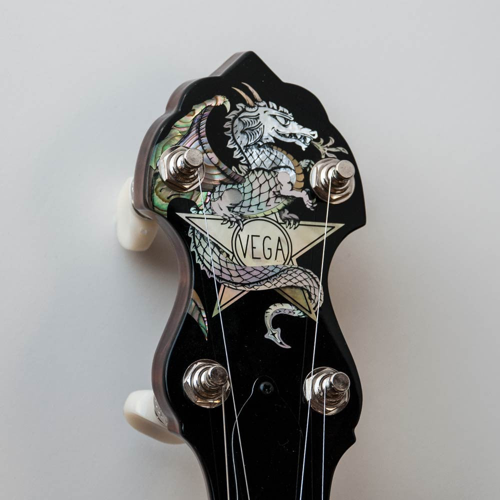 A dramatic dragon is exquisitely inlayed in mother of pearl and abalone shell in the peghead of the Vega Dragon Star. The many scaled, fire breathing dragon's tail and claws are entwined around a bold Vega star amid vividly engraved in the classical tradition. Made for the dedicated frailing/clawhammer style player, at the base of the scooped ebony fingerboard is a delicate princess colorfully inlayed with hand-engraved detailing and the accented stars that are used as position markers. Bright sterling silver beams of light emanate from the end of her hand-held staff pointing in the direction of the dragon on the peghead of this elaborate banjo.