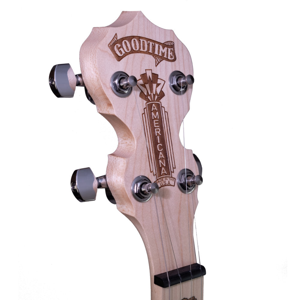 Continuing the long standing Goodtime philosophy of offering the best value American made banjos available, the Americana is the lowest priced 12” model on the market today and retains the distinctive natural blonde Goodtime aesthetics. In keeping with the rest of the Goodtime line, this banjo also features guitar style tuners, a rock maple neck, nickel plated hardware, and hardwood inlays.