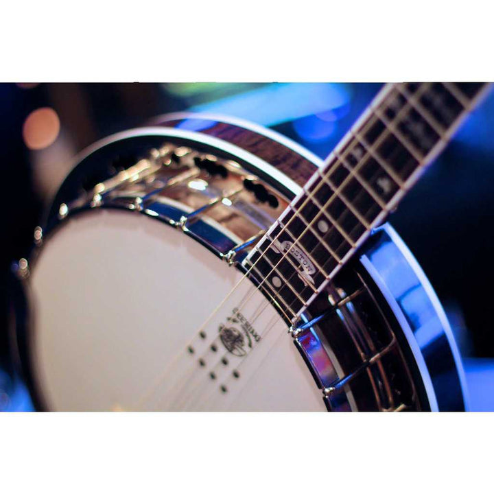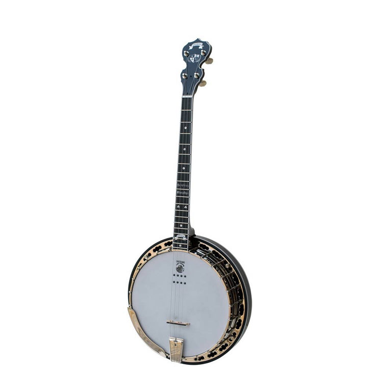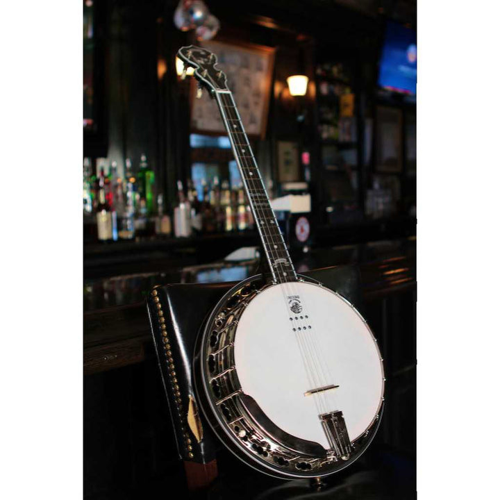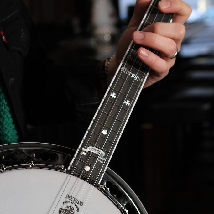 Beautifully inlayed into the fingerboard in Italian Pearloid are the name of the band in Old English lettering, two classic shamrocks and a banner proudly supporting "Boston″ at its base. Only the highest quality of curly maple wood is used for the neck and resonator on this model. A special thing about the Dropkick Murphys Model is that it is one of the lightest professional banjos made. Its' tone ring is made out of grenadillo wood rather than metal. This gives it a bright warm sound and most of all makes it easy to dance with on stage!
