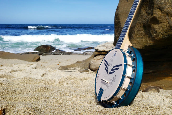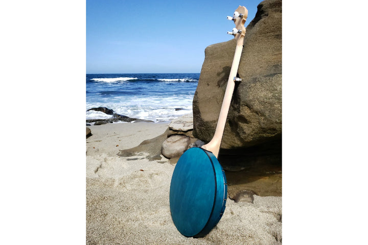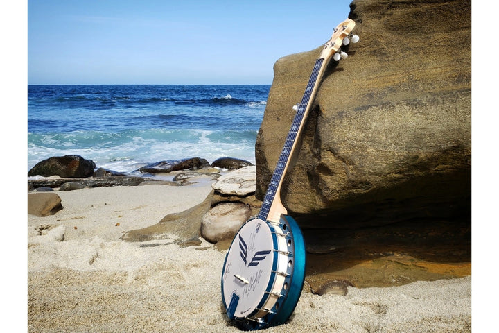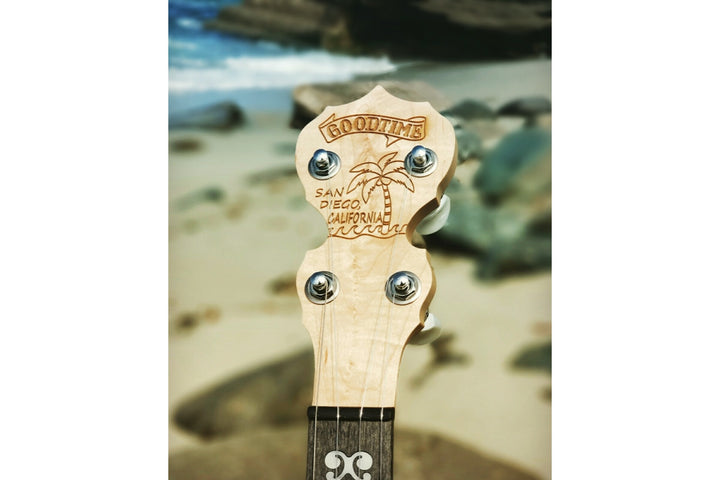 The San Diego Charity Banjo shares the beauty of the jewels of our fine city, its ocean and natural beaches. With its neck kept the natural sandy color of Maple wood with shell-white inlays, down to its ocean green-blue stained resonator and metal parts to match; with waves and a palm tree branded into the peghead, this is San Diego through and through.