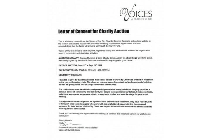 The Charity this auction will benefit is Voices of Our City Choir . The Voices of Our City Choir is transforming the perception and experience of homelessness through the healing power of the arts. Founded in 2016 by San Diego based musicians, the choir serves as a space for mutual aid and community building, as well as giving voice to San Diego's homeless community.